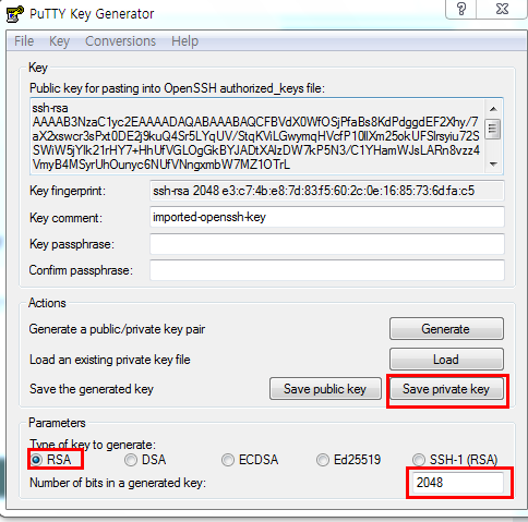 7. 아래의 Parameters 에서 Type of key to generate 에서 RSA로 설정하고 2048 기본값으로 그대로 지정한다.