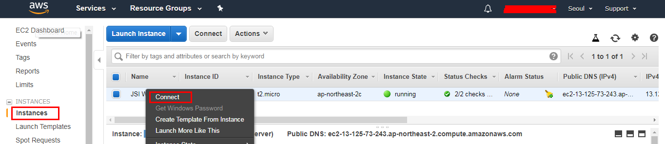 10. 다시 AWS 에서 Instances 로 접근해서 오른쪽 버튼을 눌러 Connect 을 눌러서 접속 정보를 확인
