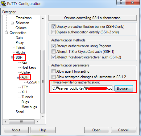 8. PuTTy 로 들어가서 SSH -> Auth 로 들어가서 만들었던 공개키를 넣어 준다.