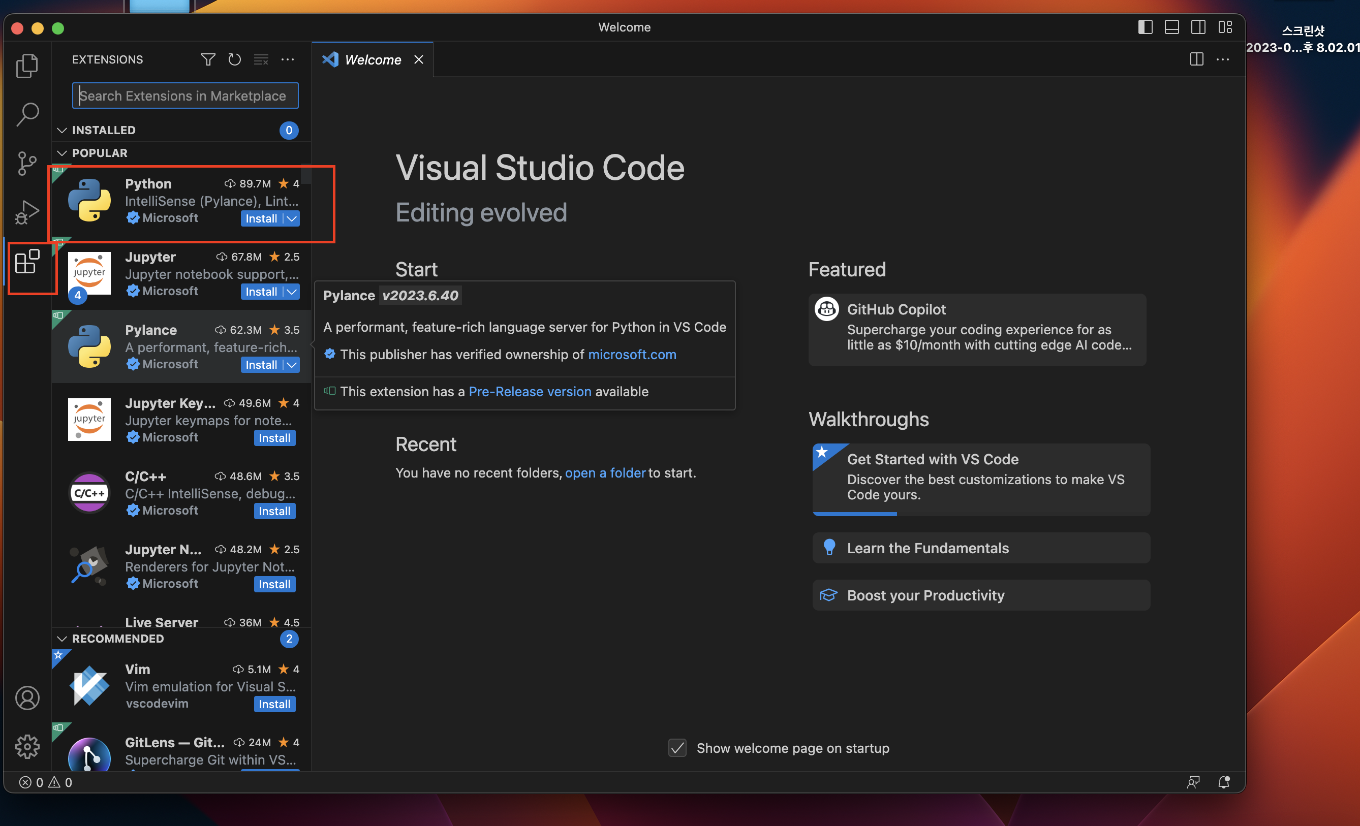 5.vscode를 실행해서 왼쪽의 파이썬 항목을 설치 한다.