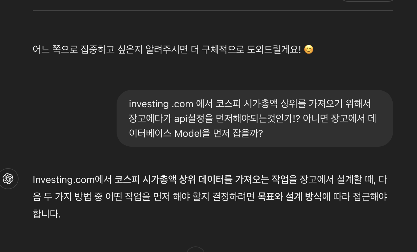 Investing.com에서 코스피 시가총액 상위 데이터를 가져오는 작업을 장고에서 설계할 때, 다음 두 가지 방법 중 어떤 작업을 먼저 해야 할지 결정하려면 목표와 설계 방식에 따라 접근해야 합니다.