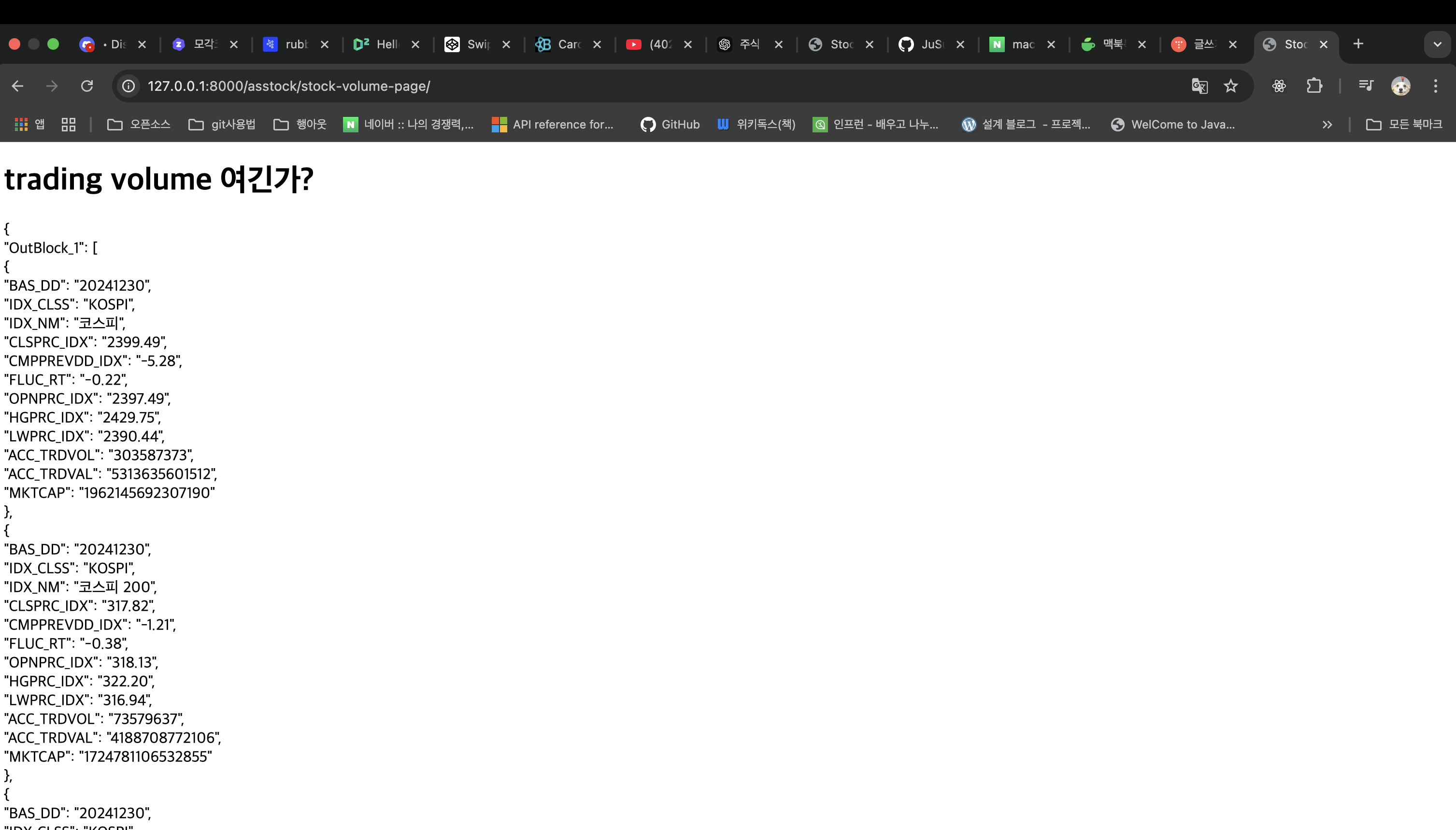 http://127.0.0.1:8000/asstock/stock-volume-page/ templates 경로에 설정한 open api 가 잘 테스트 되는걸 확인 할 수 있다.
